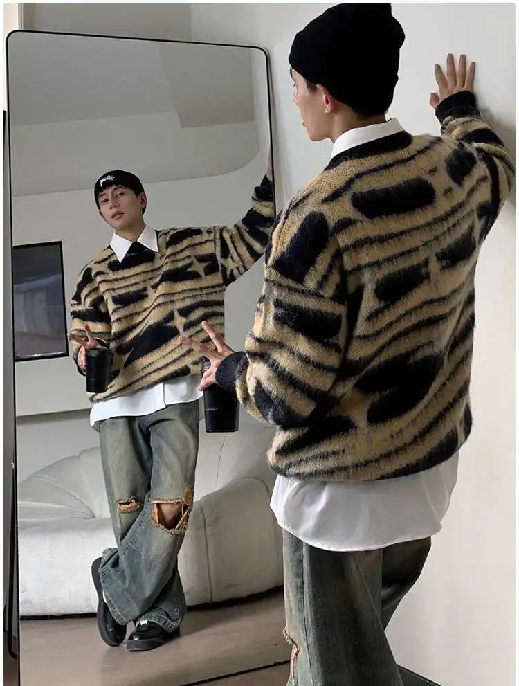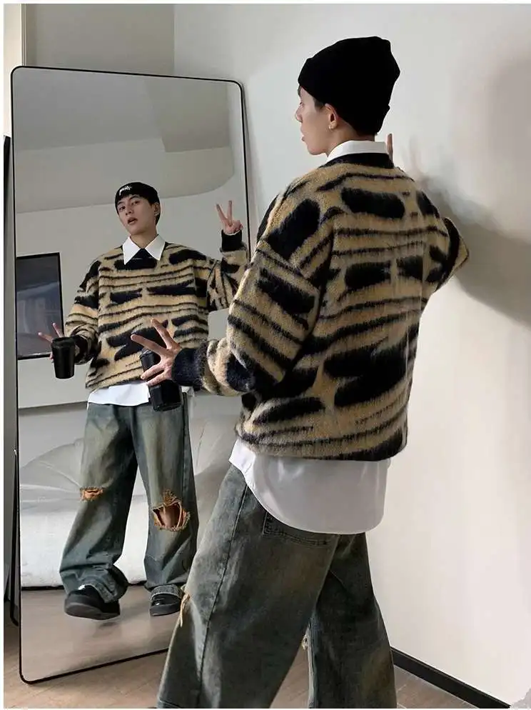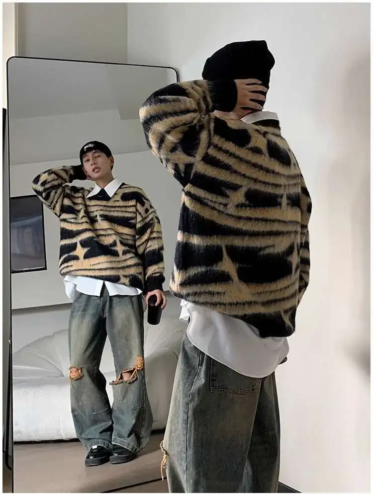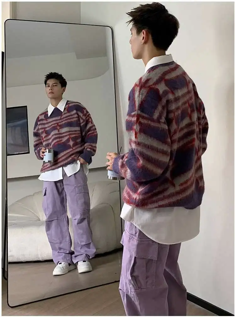 Threebooy Trendy Brand Soft Waxy Sweater for Men and Women Contrasting Colors Long Sleeves Round Neck Loose Casual Couple Pullover Jacket