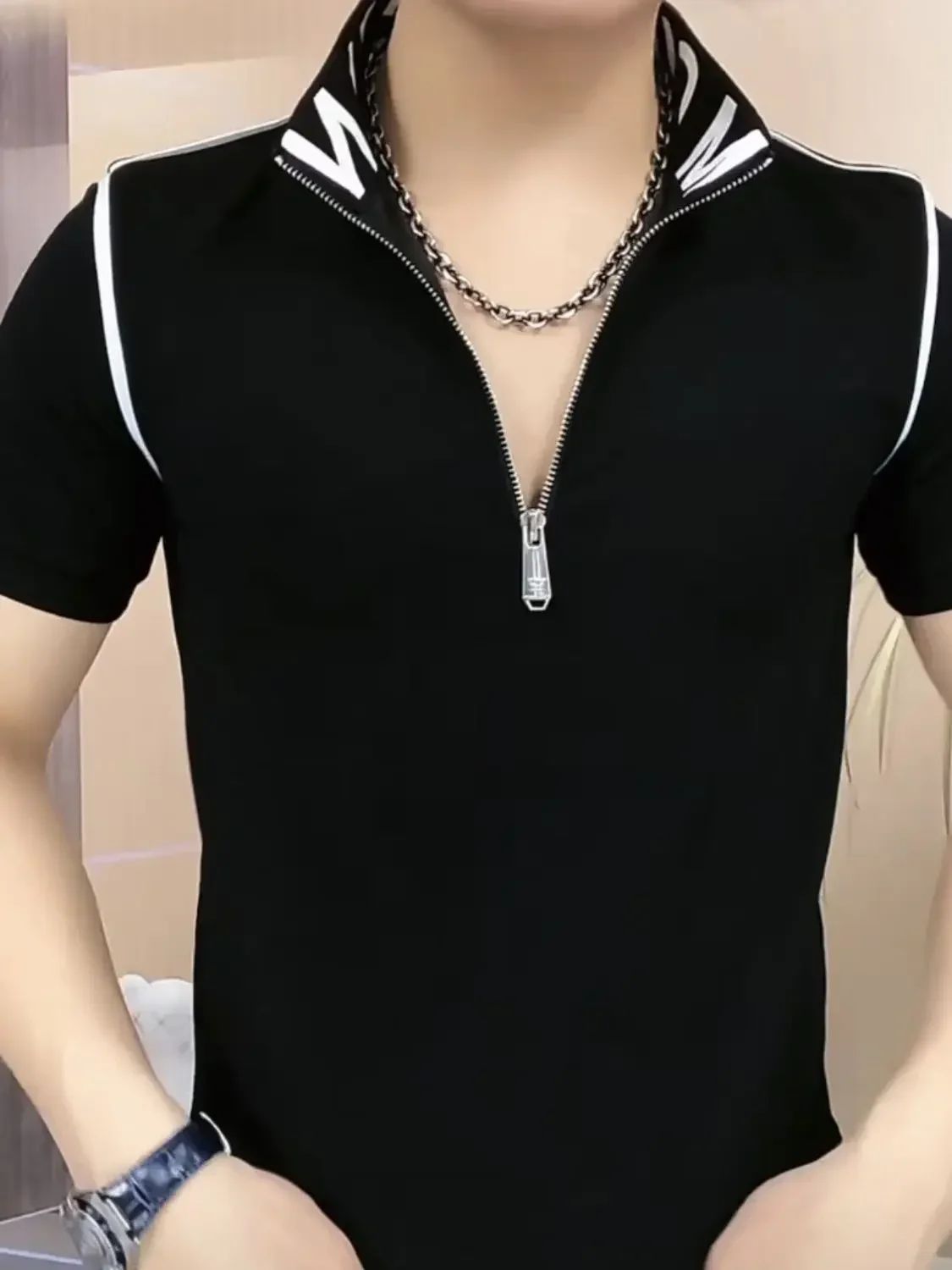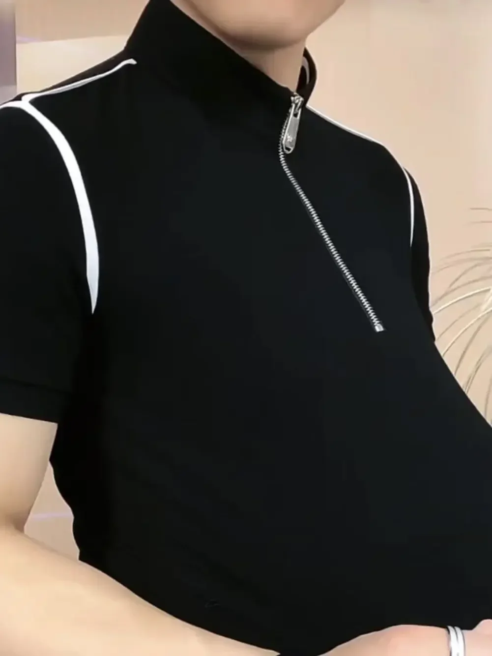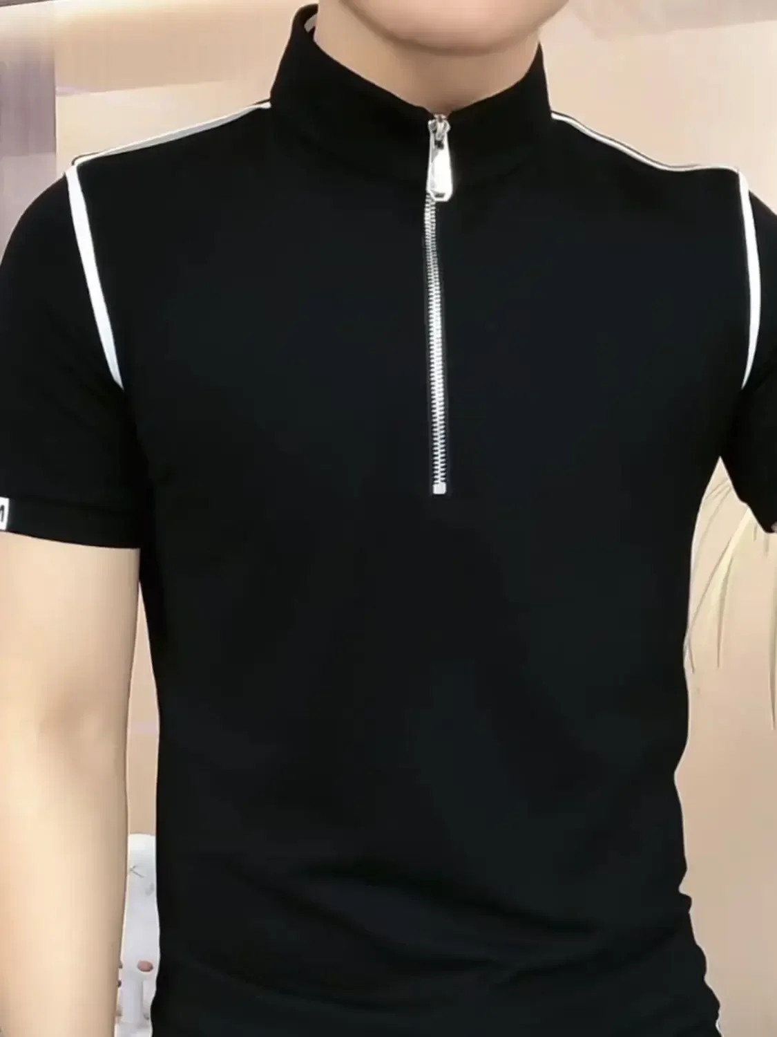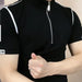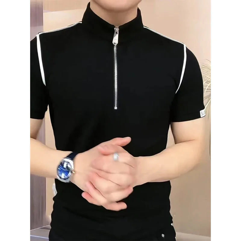 Threebooy Trendy Men's Short-sleeved Stand-up Collar Zipper Front Shoulder Contrast T-shirt Polo Shirt Light Luxury Summer Mint