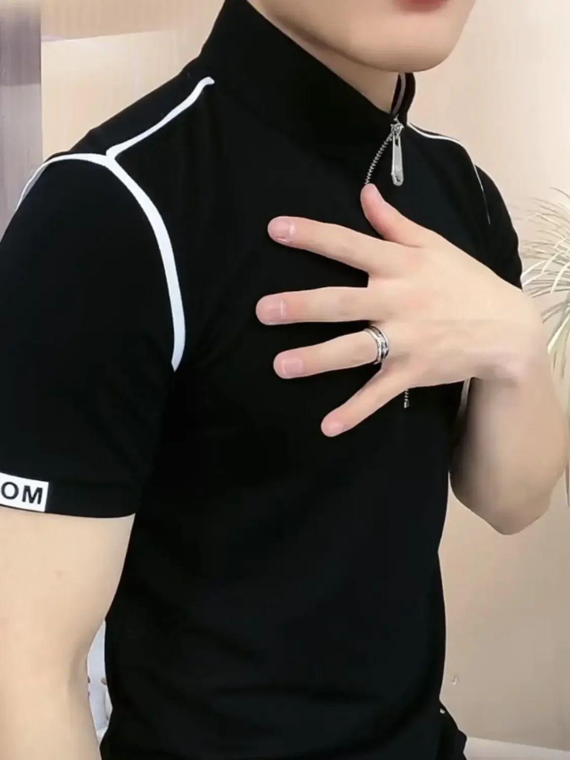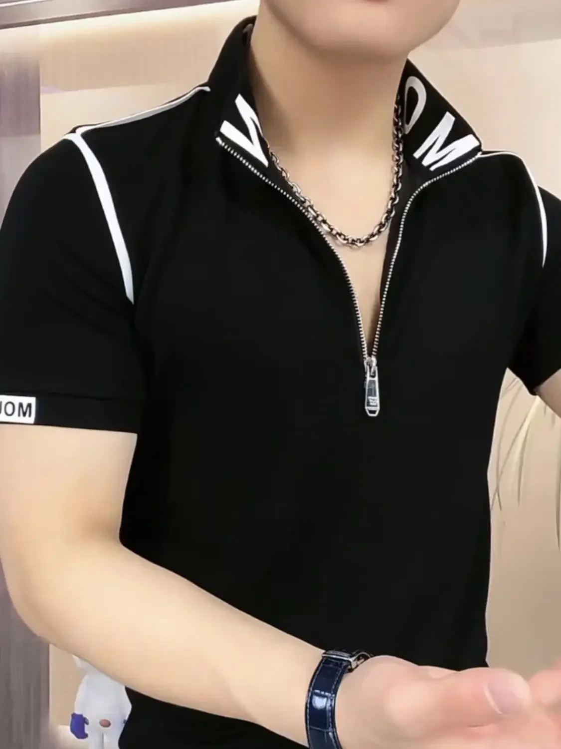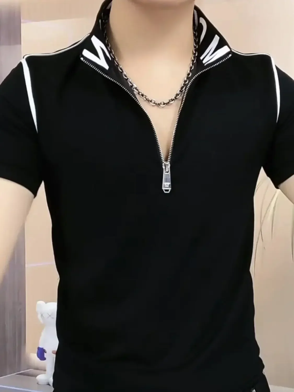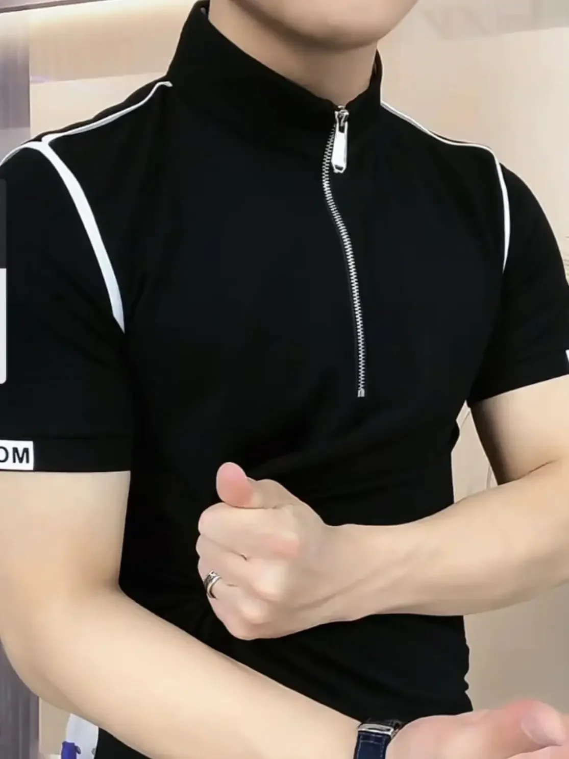 Threebooy Trendy Men's Short-sleeved Stand-up Collar Zipper Front Shoulder Contrast T-shirt Polo Shirt Light Luxury Summer Mint