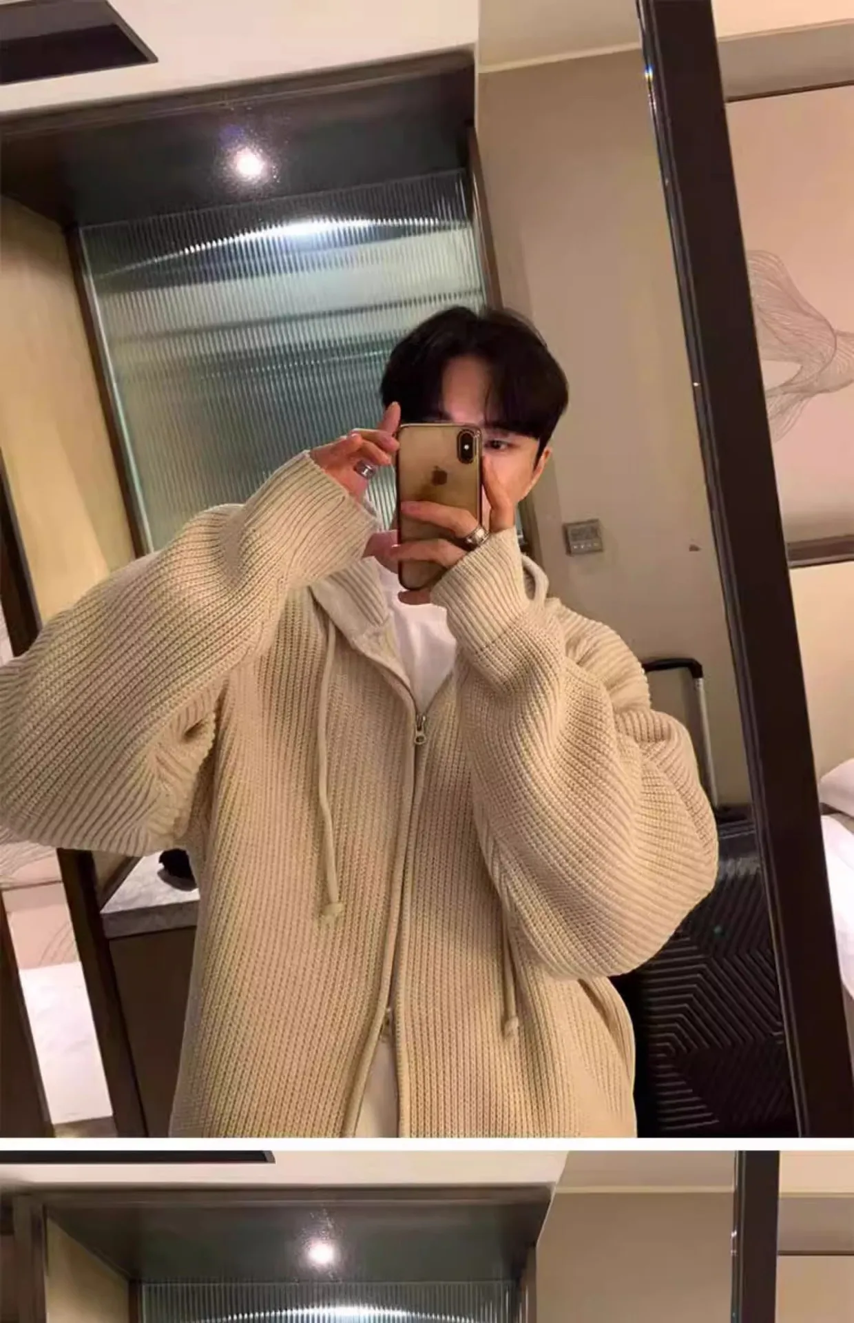 Threebooy Winter Clothing Men's Light Luxury Knit Hooded Cardigan Sweater Korean Vintage Popular Zipper Long Sleeve Loose Hoodie Knitwear
