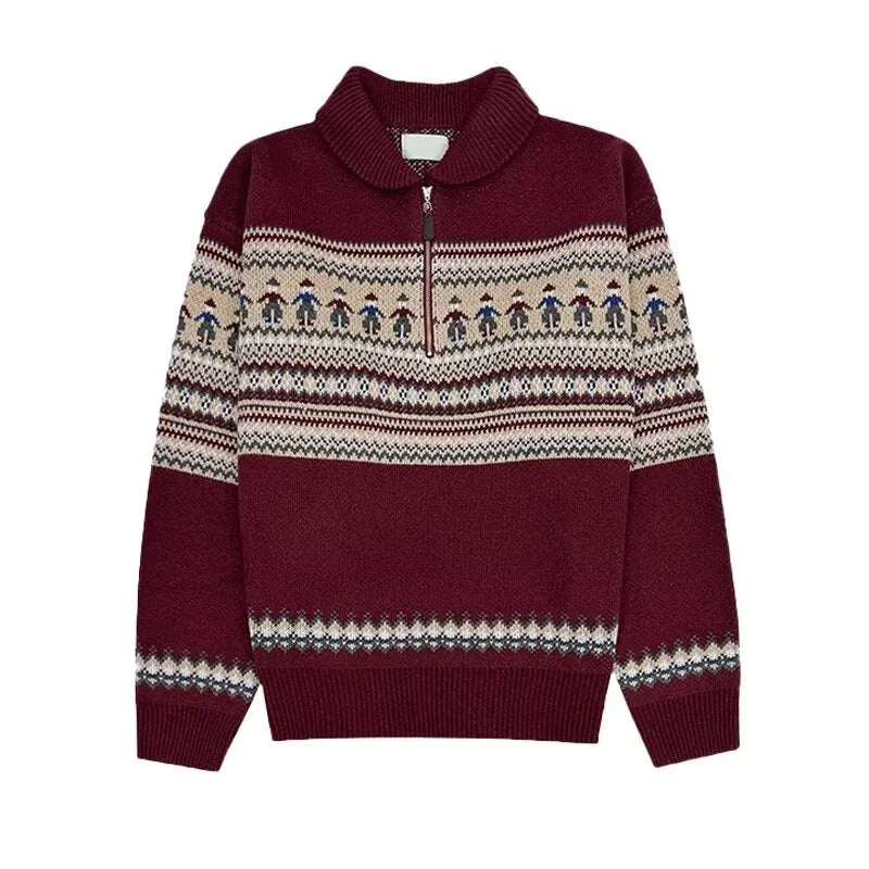 Threebooy Winter Fair Isle Half Zip Polo Neck Sweaters For Men Y2K Vintage Christmas Knitted Pullovers New Red Knitwear Man jersey