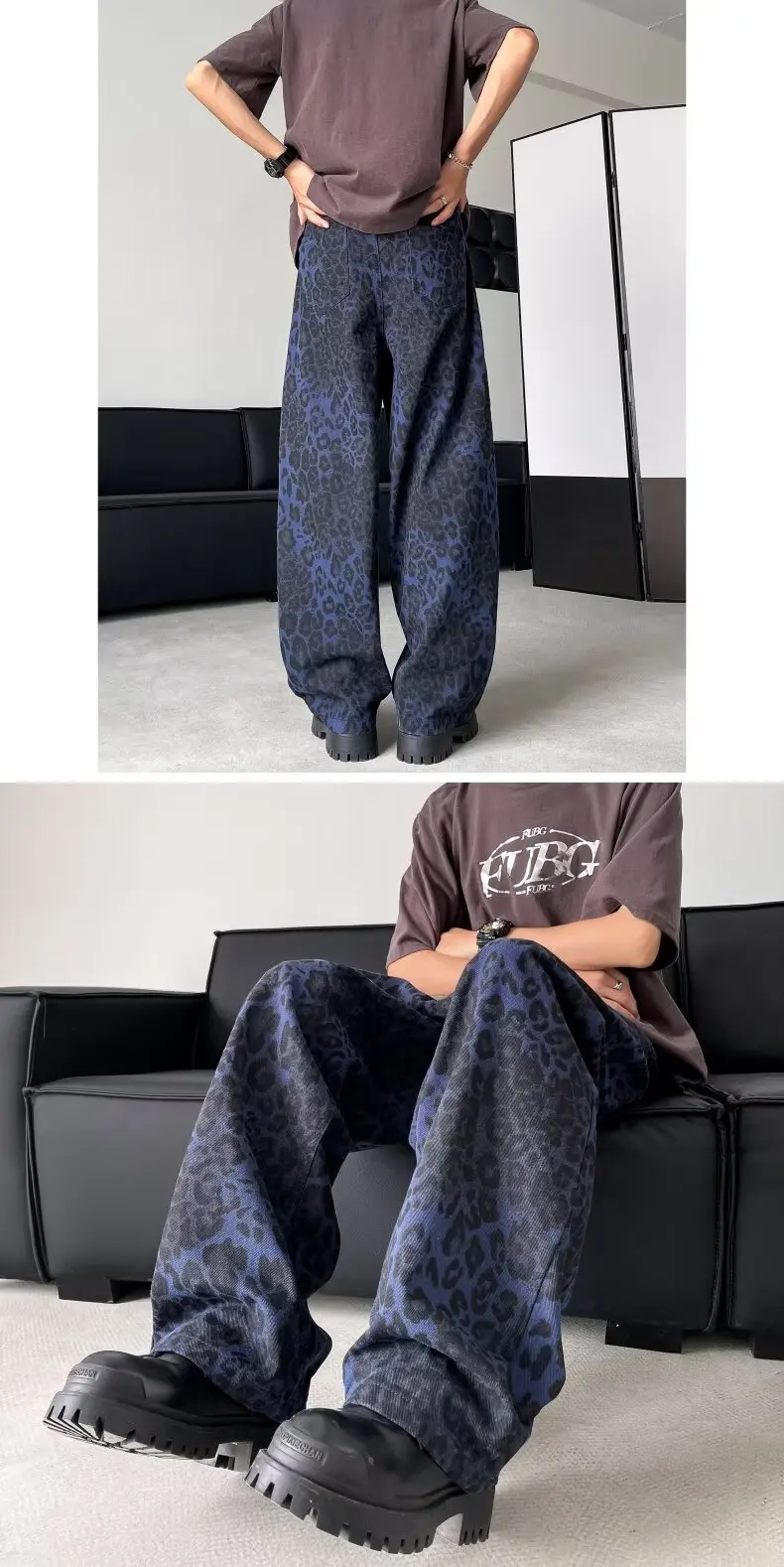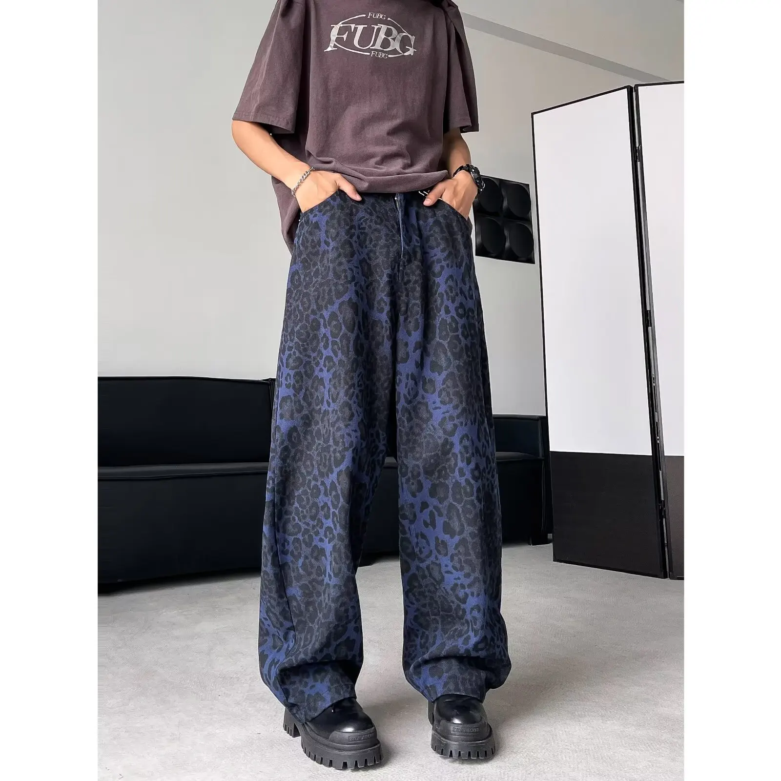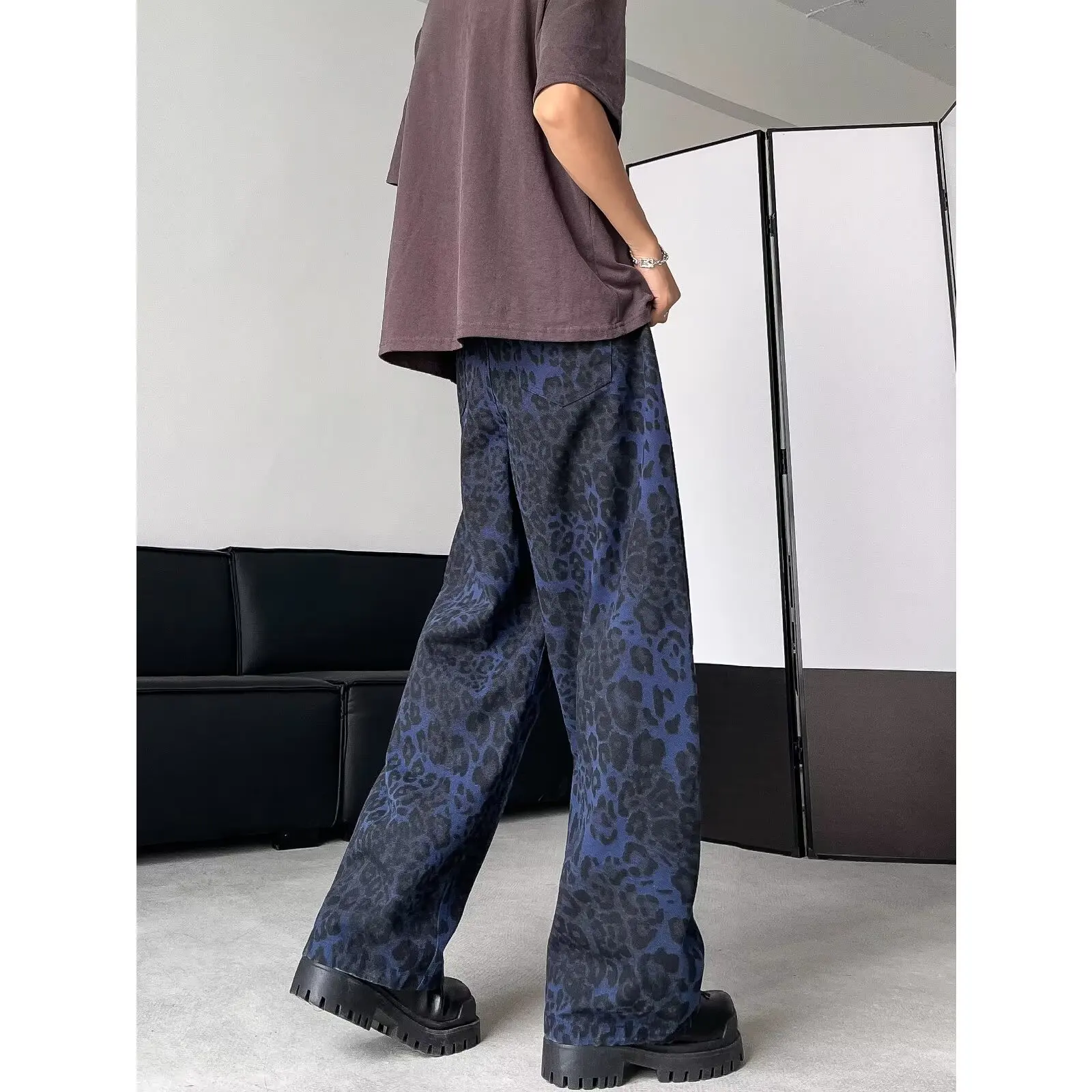 Threebooy Y2K Fashion Blue Leopard Straight Baggy Jeans Pants For Men Clothes Wide Leg Long Trousers
