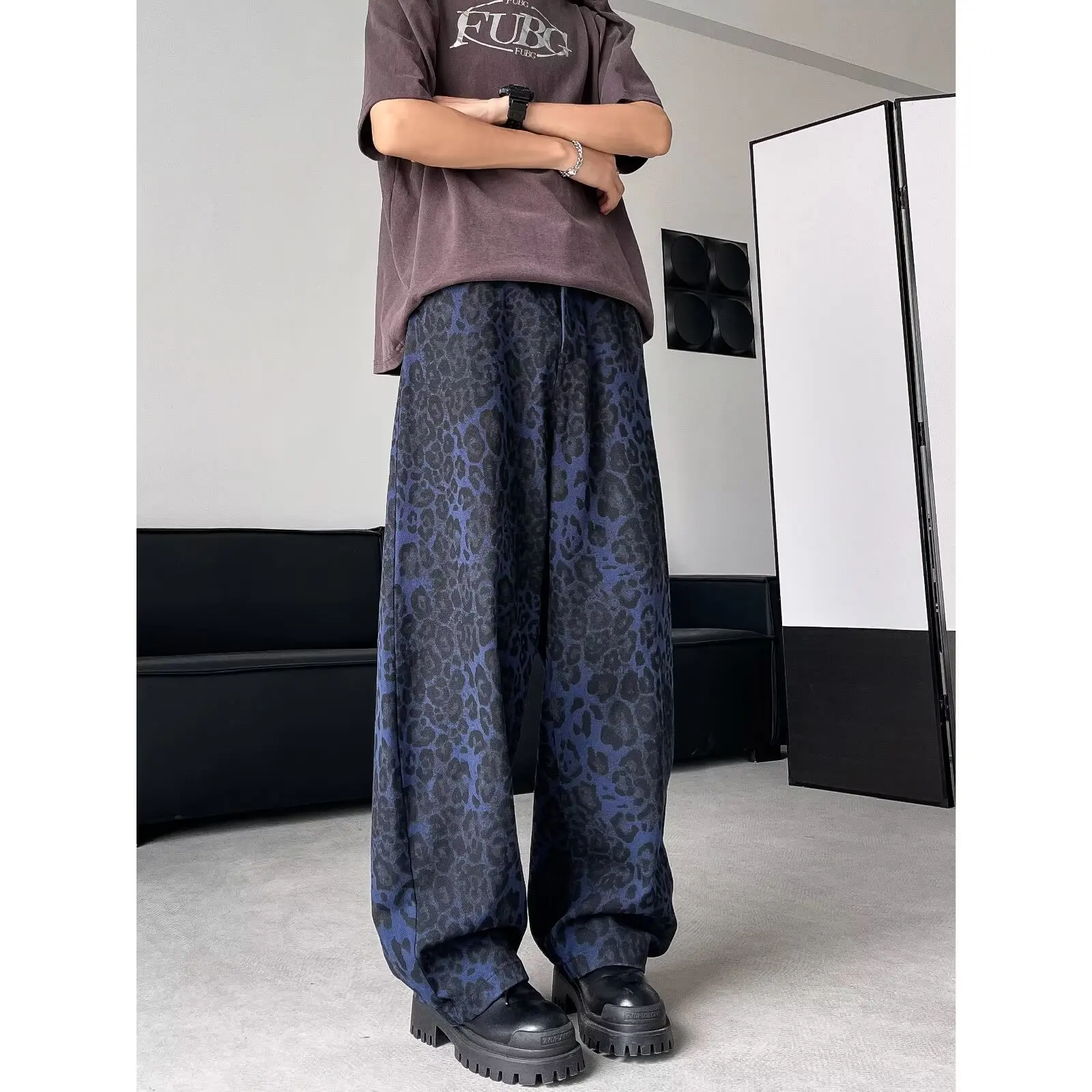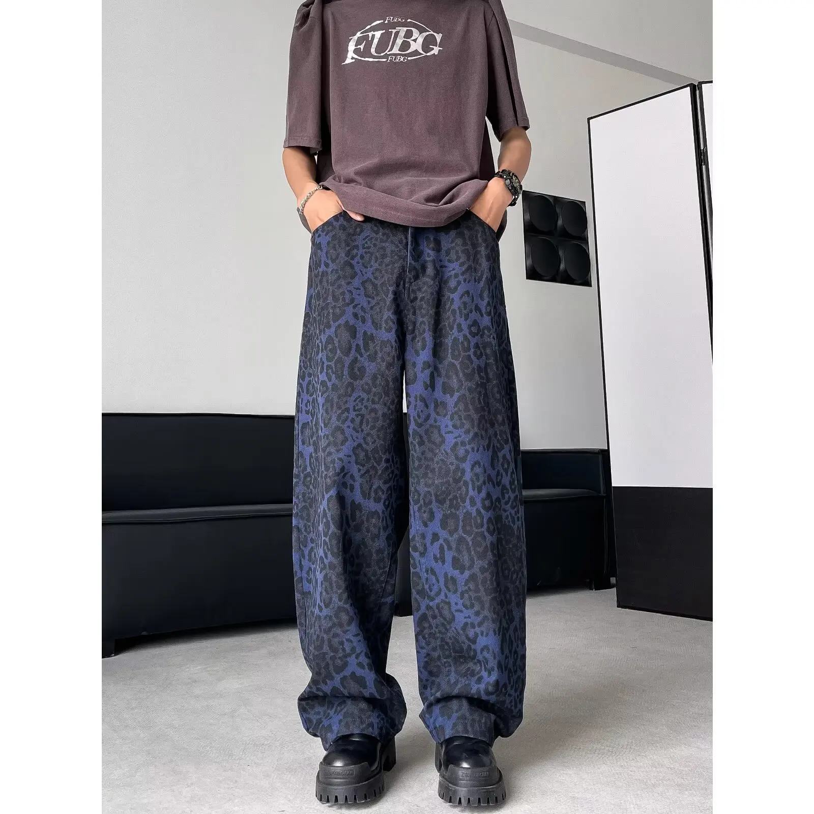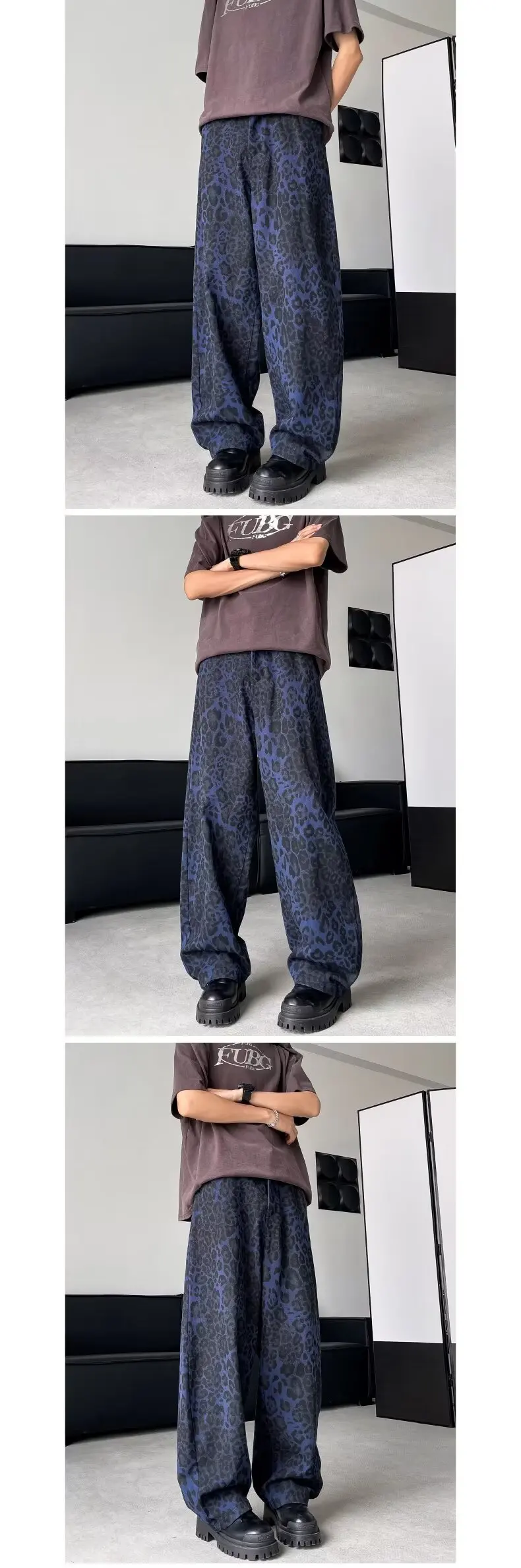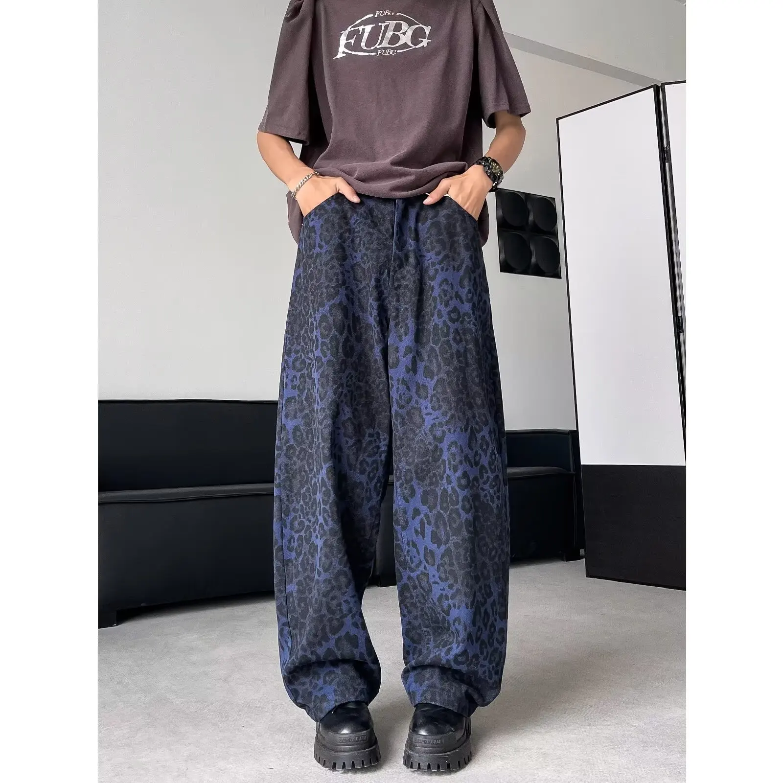 Threebooy Y2K Fashion Blue Leopard Straight Baggy Jeans Pants For Men Clothes Wide Leg Long Trousers