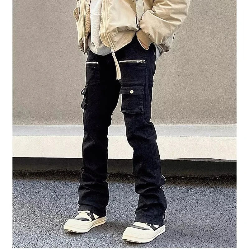 Threebooy Y2K Fashion Zipper Black Flared Jeans Cargo Pants For Men Designer Clothes Straight Solid Casual Long Trousers