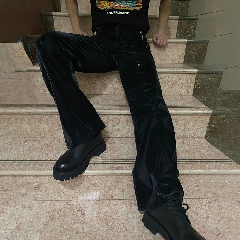 Threebooy Y2k Mens American Retro Design Punk Street Trousers Fashion High Waist Loose Versatile Split Liquid Leather Pants Unisex