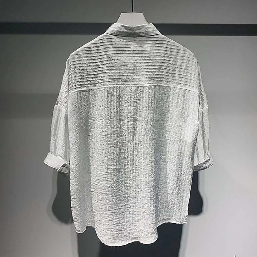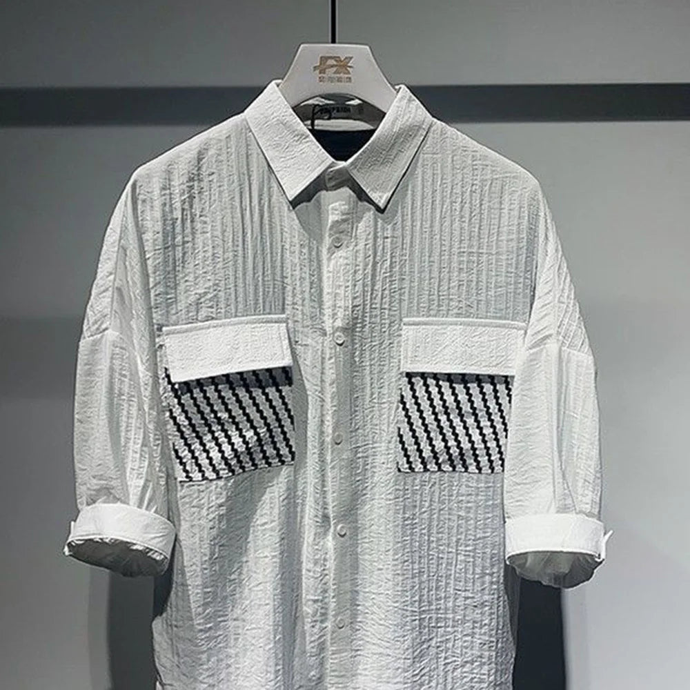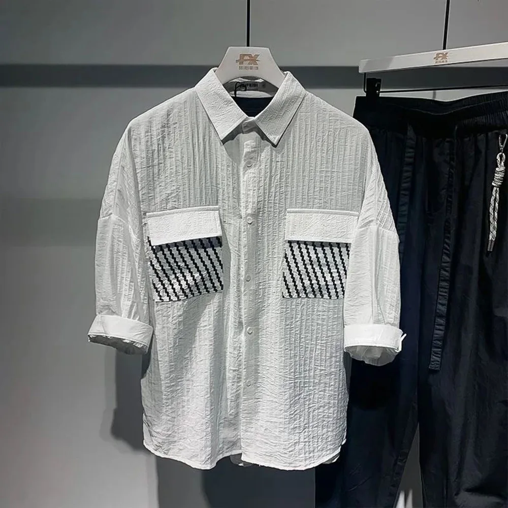 Threebooy Y2K Mens Shirt Patchwork Striped Pocket Short Sleeved Shirt Summer Casual Tassel Sequin Fashion Japanese Top Men's Clothing