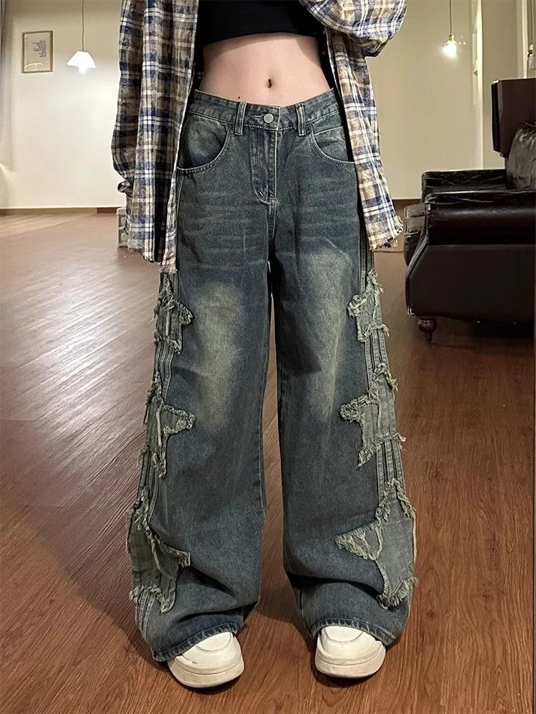 Threebooy Y2K Streetwear Star Patch Embroidery Baggy Stacked Jeans Pants For Men Clothes Wide Leg Old Straight Denim Trousers
