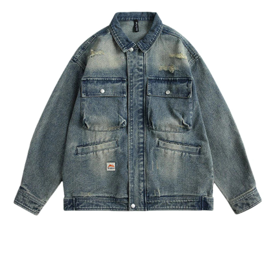 Vintage Ripped Hole Denim Jackets Mens Streetwear Punk Y2k Cargo Coats Harajuku Loose Casual Multiple Pockets Jeans Jackets Male